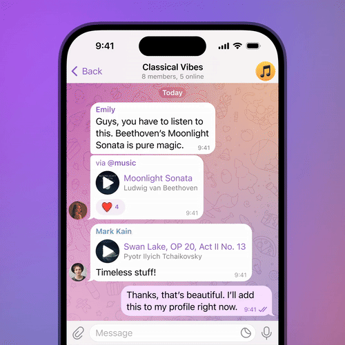 Песни из любых чатов теперь можно добавлять в профиль одним нажатием в плеере. После добавления в профиль трек появится под фотографией пользователя. При этом автоматически создаётся плейлист, который включает и предыдущие песни.
