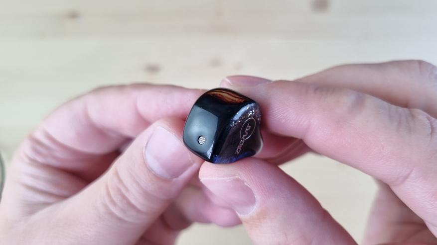 Чашечки здесь полностью из медицинской смолы, с металлическим звуководом, отверстием для компенсации направленным назад, серийным номером и абстрактным узором на внешней части.