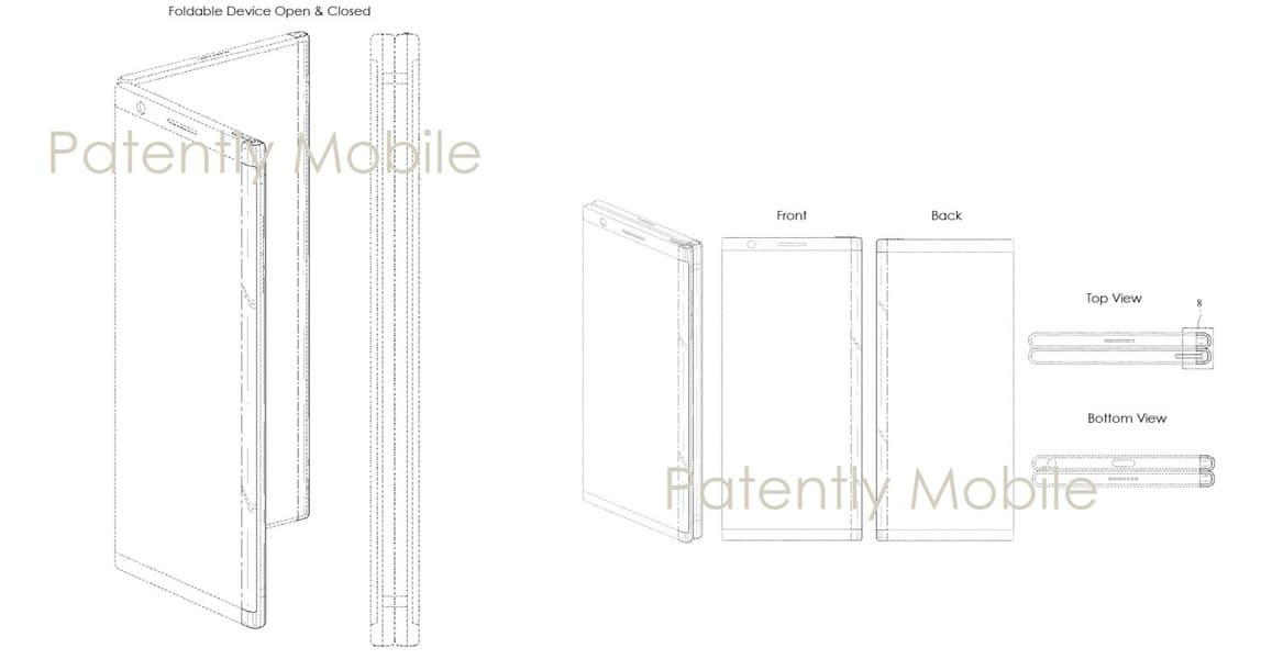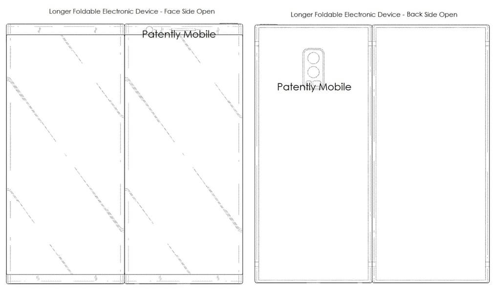 Первые два патента описывают смартфон и планшет складного типа. Смартфон складывается экранами наружу. Да, тут речь идёт не об одном гибком экране, а о двух отдельных, соединённых шарниром. Поскольку смартфон складывается дисплеями наружу, его можно установить на ровную поверхность в не до конца сложенном состоянии и получить две разные поверхности для просмотра. В таком режиме со смартфоном могут работать два пользователя одновременно.
