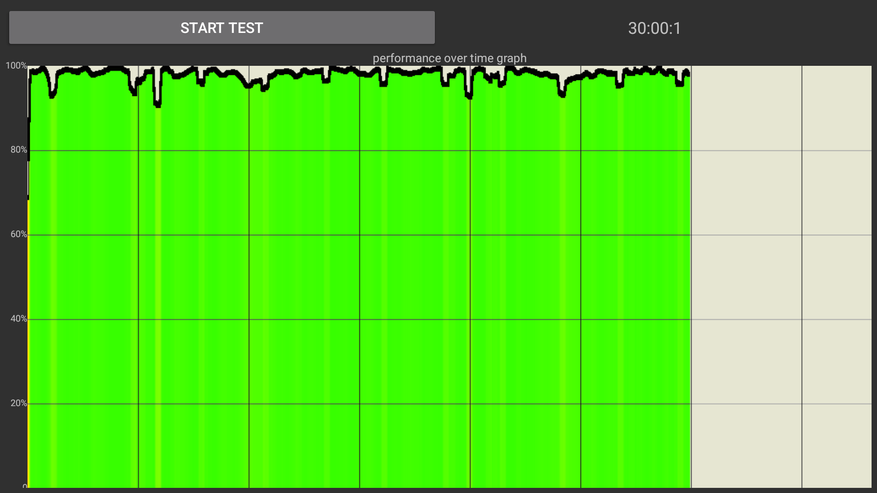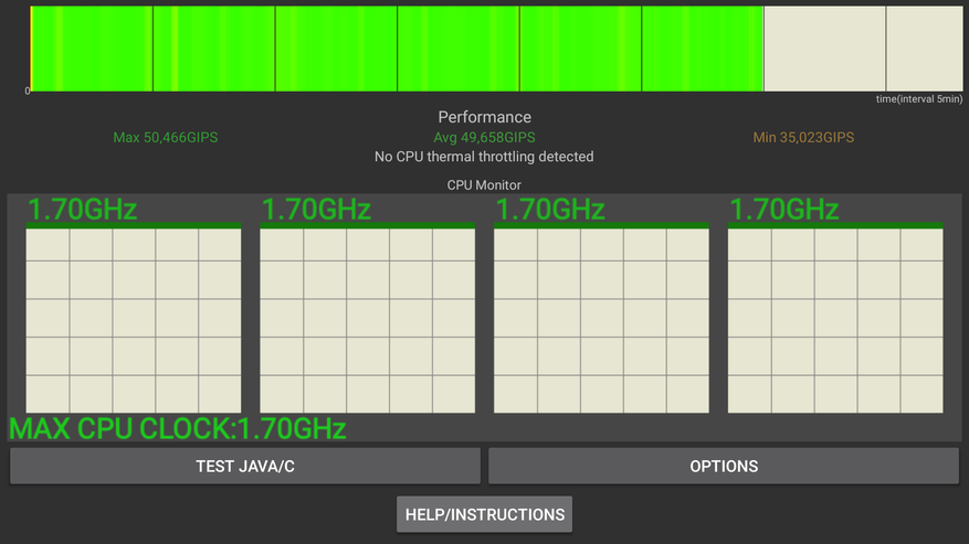 Помимо производительности было интересно провести стресс тесты и посмотреть как приставка поведет себя под тяжелой нагрузкой с учетом того, что у нее фактически отсутствует система охлаждения. 30 минутный троттлинг тест (100 потоков) показал 49,658 GIPS в среднем и ровный зеленый график, подтверждающий отсутствие троттлинга. Для примера, старшая модель RockTek GX1, где установлена более серьезная СО (крупная металлическая пластина), показал точно такие же результаты — 48,619 GIPS.