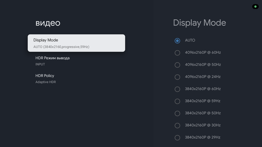 Что касается HDR форматов, то есть поддержка HDR10, HDR10+ и HLG. Приставка может работать в 3 режимах: PQHDR с улучшением изображения при помощи ИИ (HDR будет на постоянном режиме), в режиме SDR и в режиме Input, когда приставка будет включать режим вывода изображения в зависимости от воспроизводимого контента. Т. е фактически здесь присутствует адаптивный HDR, что подтверждает следующий пункт в настройках.