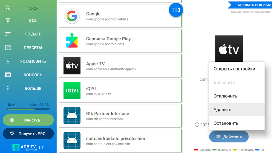 При первом включении также увидите несколько предустановленных приложений: Prime Video, iQITY, Apple TV, Youtube Music и Netflix. Стандартными методами эти приложение из системы не удаляется и засоряют экран своими бесполезными рекомендациями. Удалить ненужные можно при помощи бесплатного приложения ADB TV (с маркета). Также рекомендую установить CX Проводник, с помощью можно установить приложения, которых нет в официальном магазине. Скачиваете на компьютер нужные APK файлы и закидываете их в приложении по сети на приставку. Разумеется можно и просто закинуть на флешку, после чего установить с файлового менеджера.
