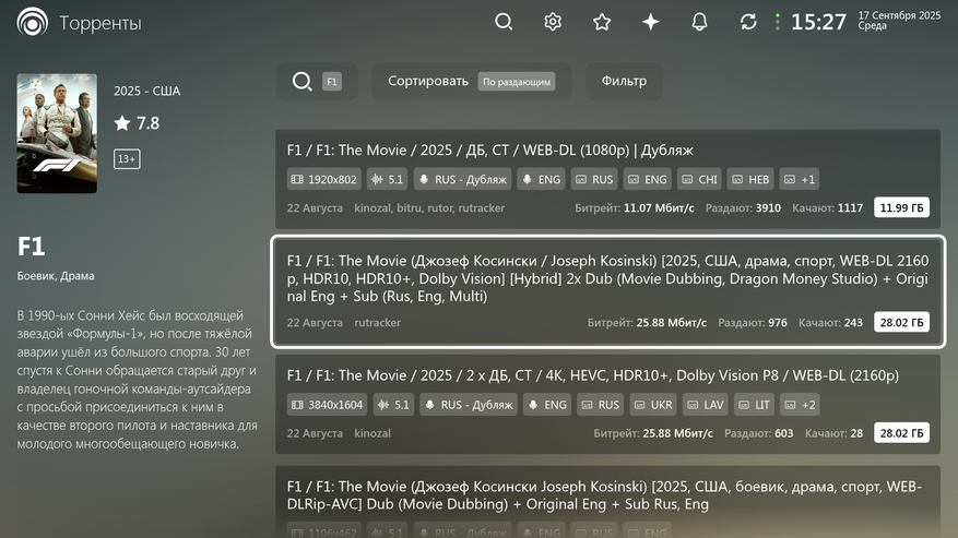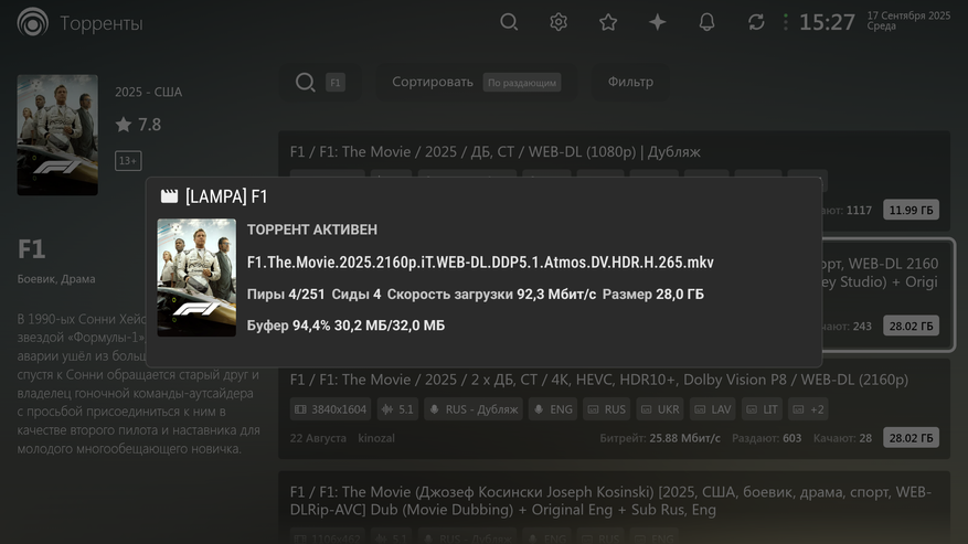 При воспроизведении через TorrServe воспроизведение без вылетов, перемотка работает, скорость буферизации (благодаря WiFi) хорошая.