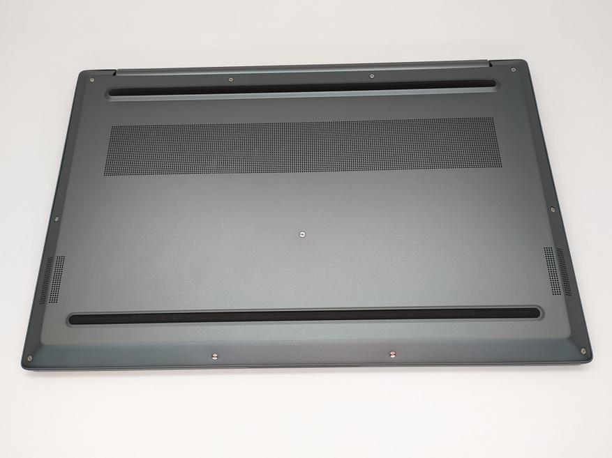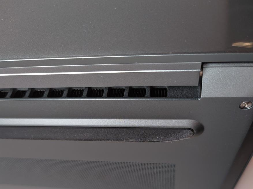 На нижней части ноутбука перфорированная часть для забора воздуха системой охлаждения и болтики крепления. По бокам есть перфорация для динамиков и по сплошной резиновой ножке в верхней и нижней части. На задней торцевой части есть два блока отверстий для выдува горячего воздуха. Выдув теплого воздуха сделан не очень удачно, воздух на выходе сталкивается с верхней крышкой и только потом идет вниз и частично вверх на экран. Вверх уходит не так много воздуха, по ощущениям, примерно 15%, а основной поток идет вниз.