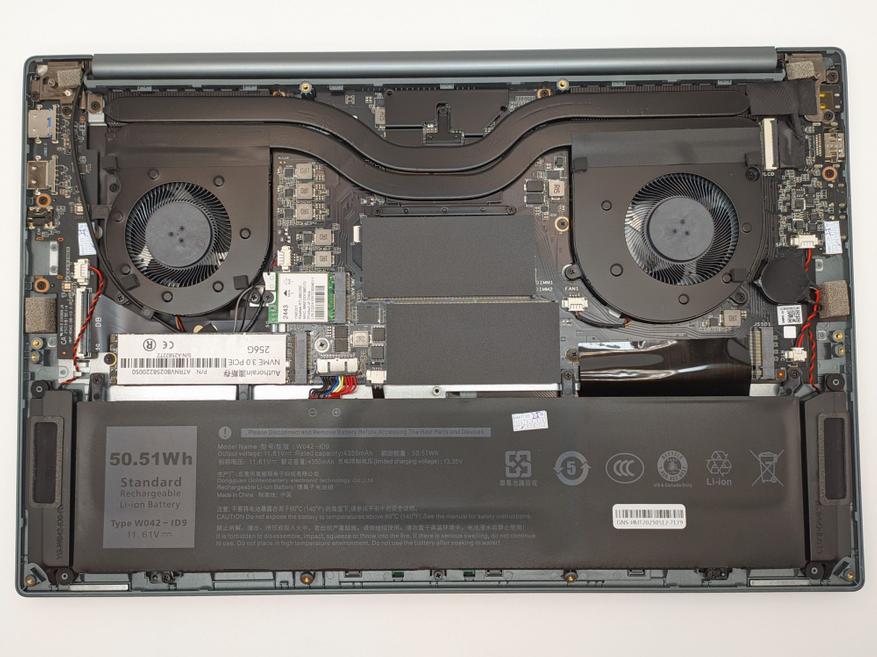 Первое, что бросается в глаза при снятии крышки, это система охлаждения основанная на двух медных пластинах и двух вентиляторах, а также большая аккумуляторная батарея на 50 ватт-часов. С завода у меня был предустановлен SSD M.2 NVMe накопитель на 256 Гб и одна плашка памяти на 16 Гб. Как можно видеть, здесь есть еще один разъем для накопителя и два слота для оперативной памяти. Слоты оперативной памяти прикрыты отгибающейся пластиной из тонкого пластика. Также установлен модуль беспроводной связи в разъеме M.2. На видном месте расположилась батарейка биоса, которую можно отсоединить, и два довольно крупных корпуса для динамиков по краям в нижней части.