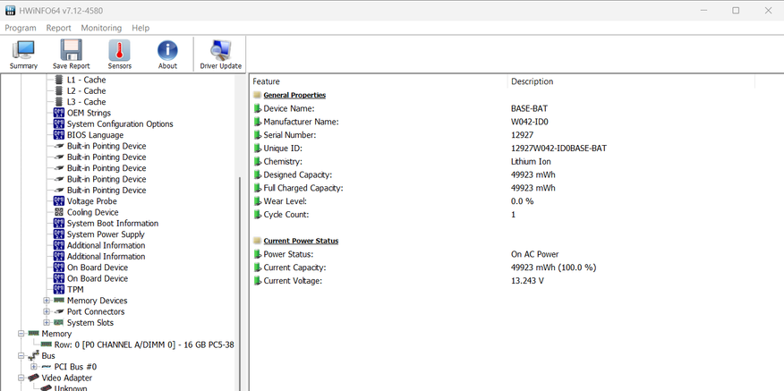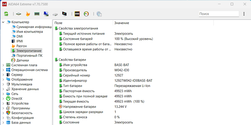 Производитель в описании ноутбука заявляет о 54,29 ват-часах, но на аккумуляторе ноутбука указано 50,51 Wh, и то же самое подтверждают данные отображаемые в AIDA64 и HWiNFO.