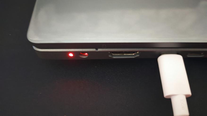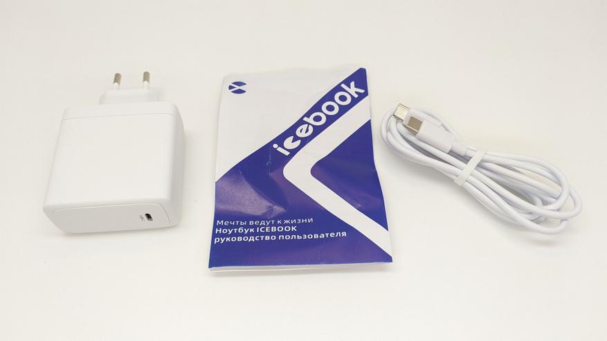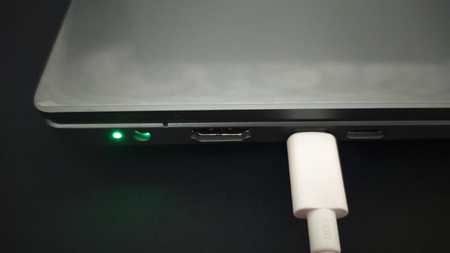 Блок питания положили без указания бренда с разъемом type-C. Видимо, просто заказали на OEM-фабрике, но нормальный блок питания. У него несколько автоматических режимов, но максимальные значения — 100 ватт при 20 вольтах и 5 амперах. При зарядке выключенного разряженного ноутбука прибор показывал потребление из розетки, начиная с 35 ватт, потом постепенно дошло до 40, а после примерно 3/4 зарядки аккумулятора потребление начало постепенно снижаться и при 92% было уже 11 ватт. За первый час аккумулятор ноутбука зарядился до 63% (включил, посмотрел и выключил), а за следующие 45 минут до 92%. Блок питания при зарядке греется, но на безопасном уровне, а вот нагрева в области аккумулятора ноутбука я не почувствовал. При зарядке светодиод светит красным, при полном заряде ноутбука — зеленым. Да, и еще раз про такой момент — к ноутбуку можно подключить DC-адаптер с круглым разъемом 3,5х1,35 мм. Какие-то дополнительные рекомендованные параметры стороннего блока питания взять негде.