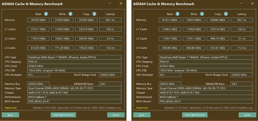 Если оставить одну плашку памяти, то ноутбук заметно потеряет в производительности в играх и немного в вычислительной мощности процессора. Для обычного офисного использования, просмотра видео и серфинга в интернете можно не добавлять еще одну плашку, прирост будет практически не заметен. Ну, а как это проявляется в бенчмарках, можно увидеть на скринах ниже, где первый результат для одной плашки памяти, а второй — для двух. Да, скорость всегда будет ограничена самой медленной плашкой памяти, поэтому если вы планируете оставить стоковую, то докупать к ней более быструю память смысла нет. Главное, чтобы она была не медленнее, и по таймингам в том числе, о чем говорит маркировка CL.