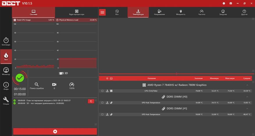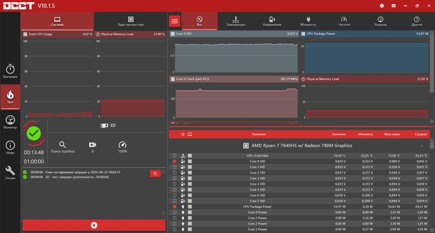 Тесты игр были проведены в Turbo-режиме работы ноутбука. Судя по энергопотреблению из розетки, никаких ограничений в скорости работы процессора и видеоядра не было. Да и в общем в тестах видно, что энергопотребление процессора почти всегда составляет максимальные 55 ватт. К сожалению, в MSI Afterburner не было пунктов, отвечающих за температуру, поэтому я сделал 15-минутный тест в OCCT. Тест проводил в нагрузке с графическим ядром, и максимальная температура в режиме Turbo была 71,5 градус.