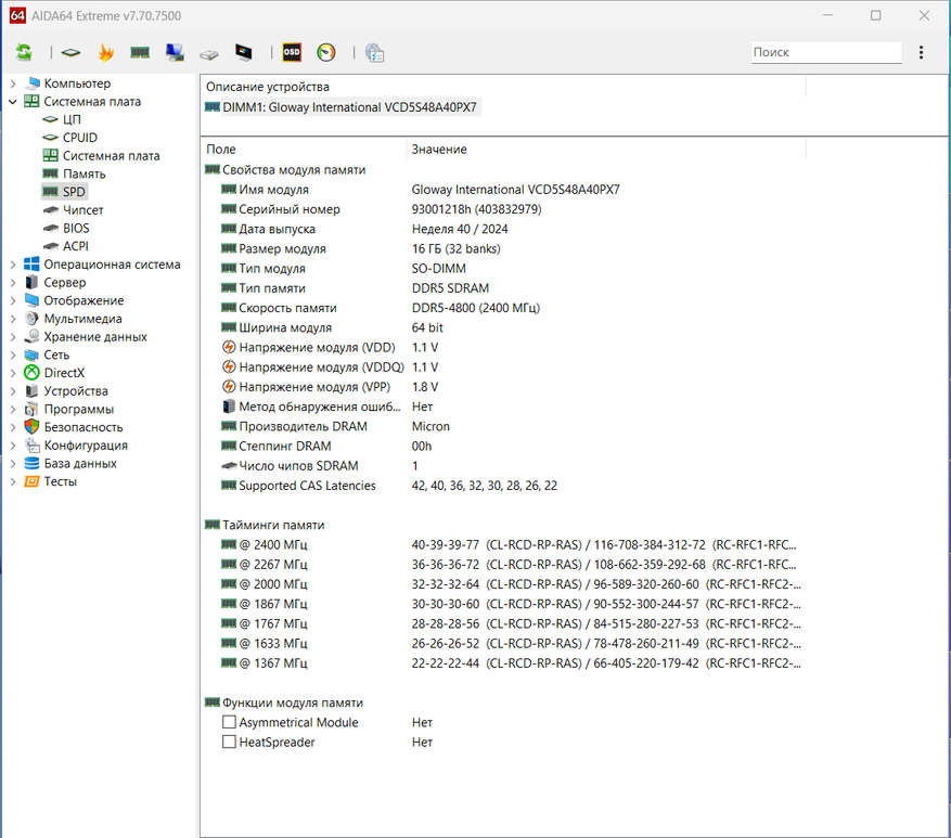 Оперативная память DDR5 Gloway 4800 16 Гб, 1.1 V, CL40