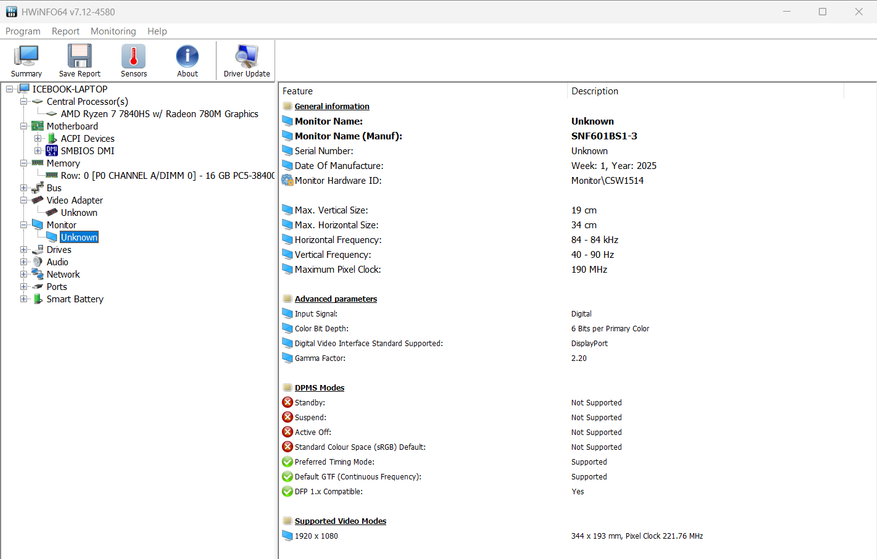 Про звук здесь обо многом не расскажешь, звук нормальной громкости, но без особых низких частот. В играх и в видео со встроенным звуком всё хорошо слышно, и громкости хватает не только в тихом помещении. По HDMI можно подключить внешний монитор или проектор, но у недорогих проекторов есть инпут-лаг, поэтому для игр такое решение не подойдет. Также добавлю скриншоты, что пишут HWiNFO и AIDA64 об экране ноутбука.