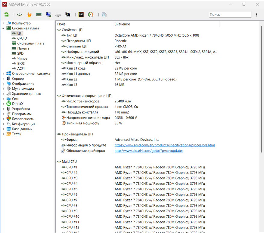Процессор AMD Ryzen 7 7840HS (8 ядер 16 потоков, до 5,1 ГГц)