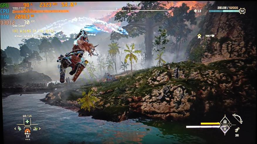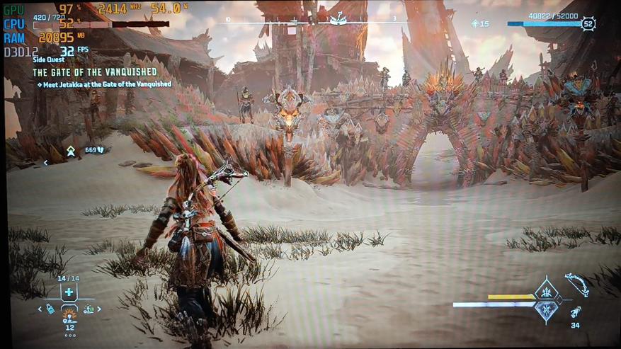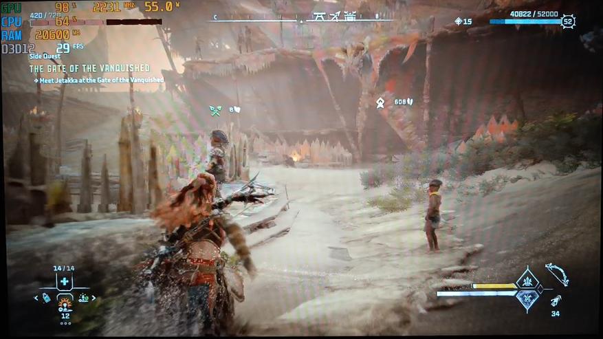 В игре Horizon Forbidden West, которая, стоит отменить, довольно прожорливая, при низких и очень низких глобальных настройках FPS находился в районе 30 с небольшими просадками в экшен-сценах и там, где много народа. На очень низких настройках геймплей был ровнее и почти без фризов, а вот на низких фризы проскальзывали. Графику никак дополнительно не настраивал, доверился предустановленным глобальным настройкам.