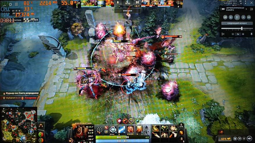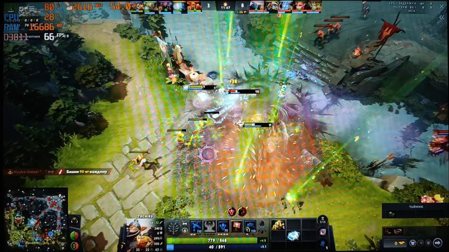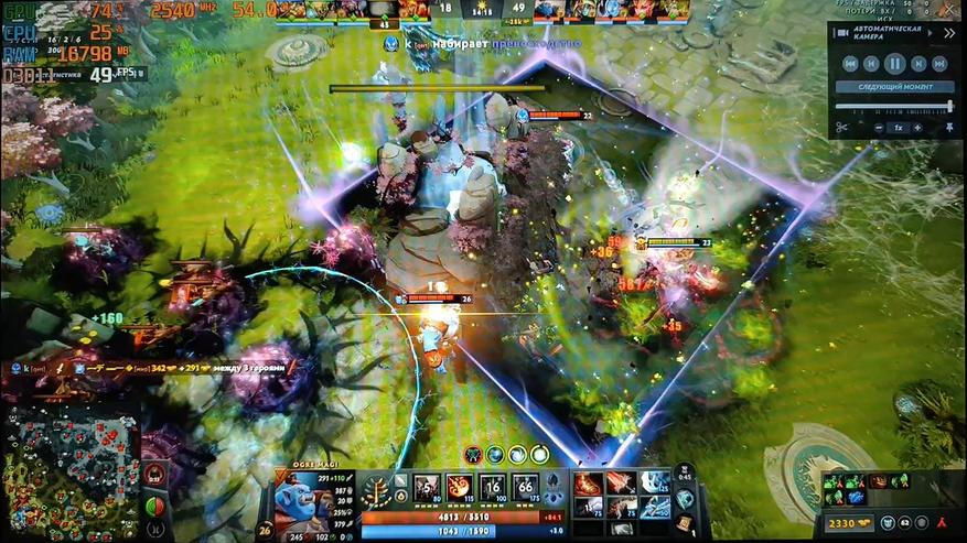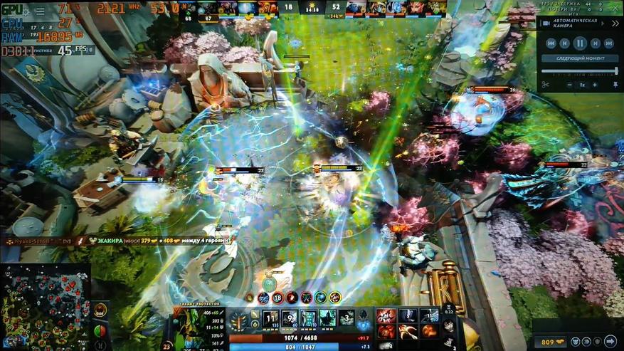 Первой была Dota 2 в разрешении 1920х1080, с практически максимальными настройками графики, кроме выключенных анимированных портретов, и тени стояли на среднем значении. FPS менялся в зависимости от событий, и так на линии было +/- 75 FPS, а в жестких замесах моментами проседал и до 45, хотя обычно был в районе 55.