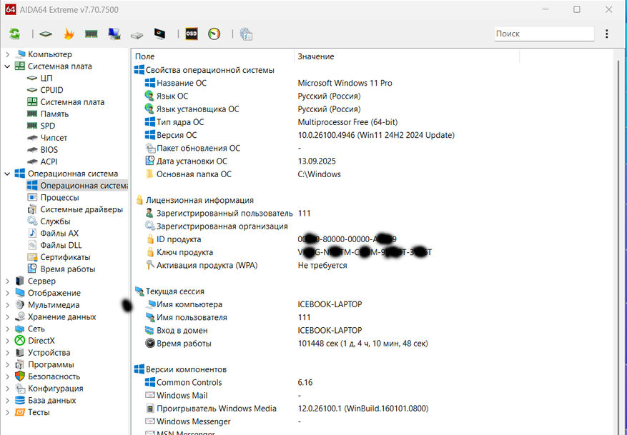 На ноутбуке установлена активированная Windows 11 Pro. Никаких наклеек или бумажек с ключом активации нет, но ключ можно посмотреть в AIDA64 на вкладке «Операционная система».