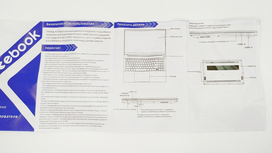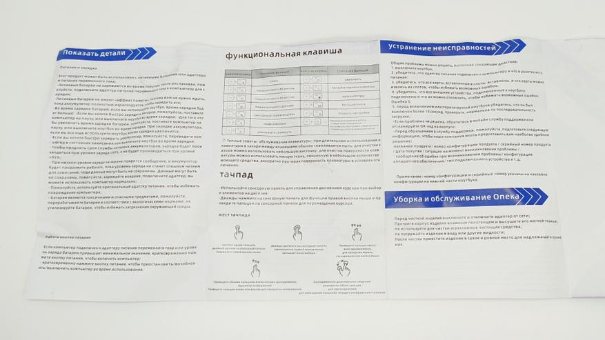 Приятным бонусом была пусть и небольшая инструкция, но на русском языке. Там описаны разъемы ноутбука, а также управление некоторыми функциями и очень важное — это управление тачпадом. Оказалось, что эта штука очень даже функциональная.