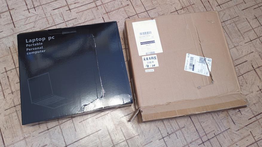 Упаковка в этот раз меня вообще не порадовала и даже немного испугала. Фирменная упаковочная коробка от ноутбука, которая, в общем, как фирменная и не выглядит, была упакована в транспортировочную картонную коробку под размер упаковочной. И она была продавлена в одном месте. Достаточно сильно, чтобы возникли некоторые опасения, что ноутбук мог пострадать. По новым правилам четырехбуквенного маркета теперь в пункте выдачи можно вскрыть упаковку, осмотреть и даже включить товар, что я там же и сделал. Мои опасения не подтвердились, и то, что продавило коробку, до ноутбука не достало.