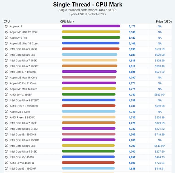 Платформы Apple M в своё время совершили революцию на рынке, но и SoC Apple A не особо-то от них отстают. Более того, новейшая Apple A19 вообще стала самым производительным процессором в рейтинге PassMark в однопоточном режиме.