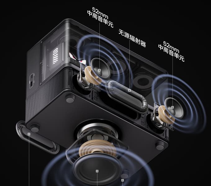На самом же деле это исключительно акустическая система. Если точнее, внутри имеется сабвуфер, два широкополосных динамика и три пассивных излучателя. Суммарная мощность заявлена равной 60 Вт.