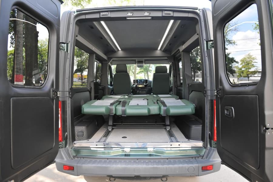 Глубина багажного отделения варьируется за счёт перемещения или полного снятия диванов с быстросъёмных креплений. Переднее одноместное кресло обеспечивает свободный проход из кабины в салон.