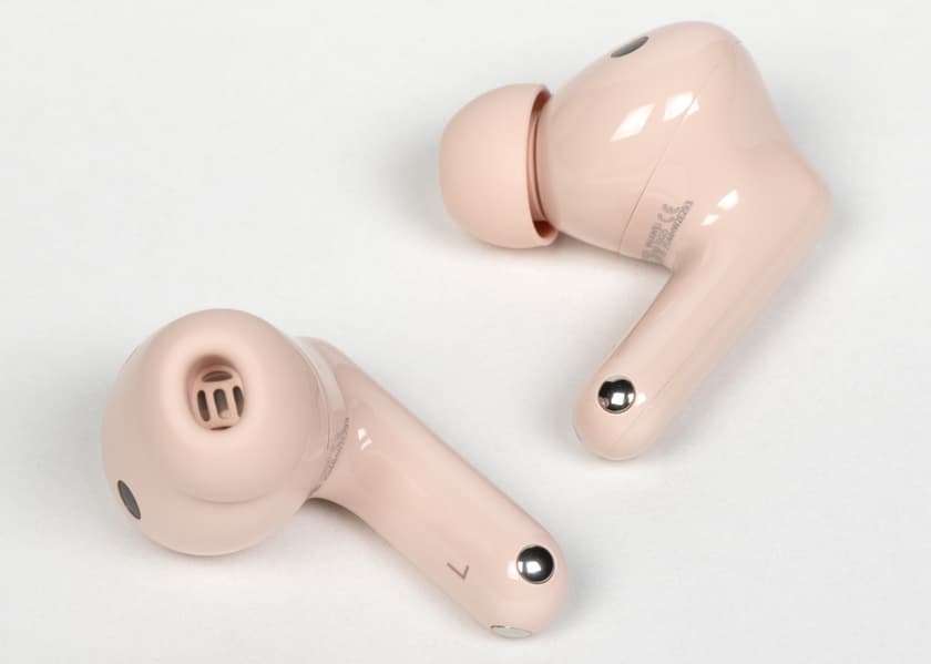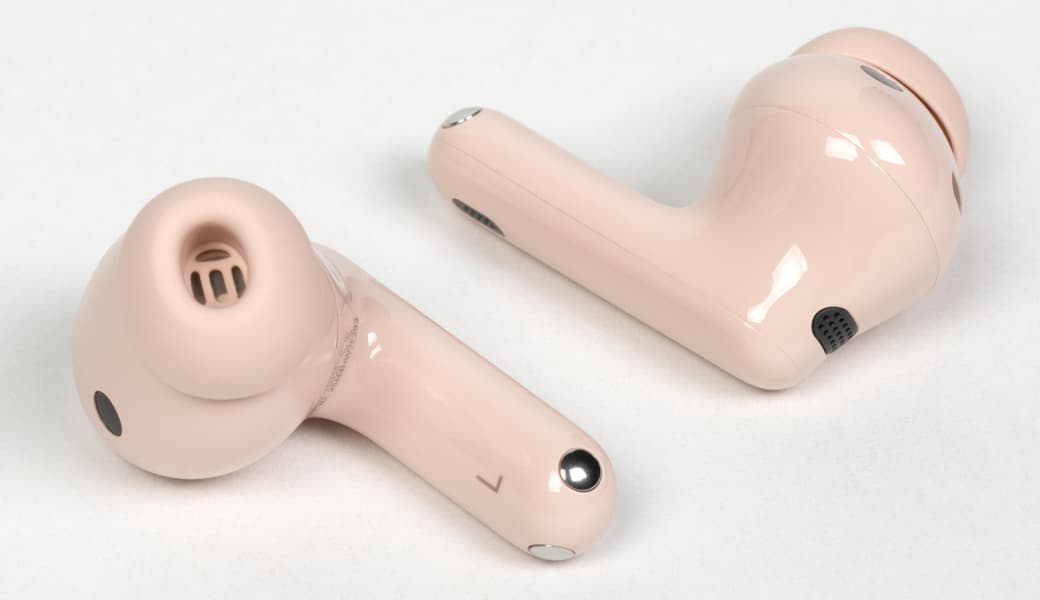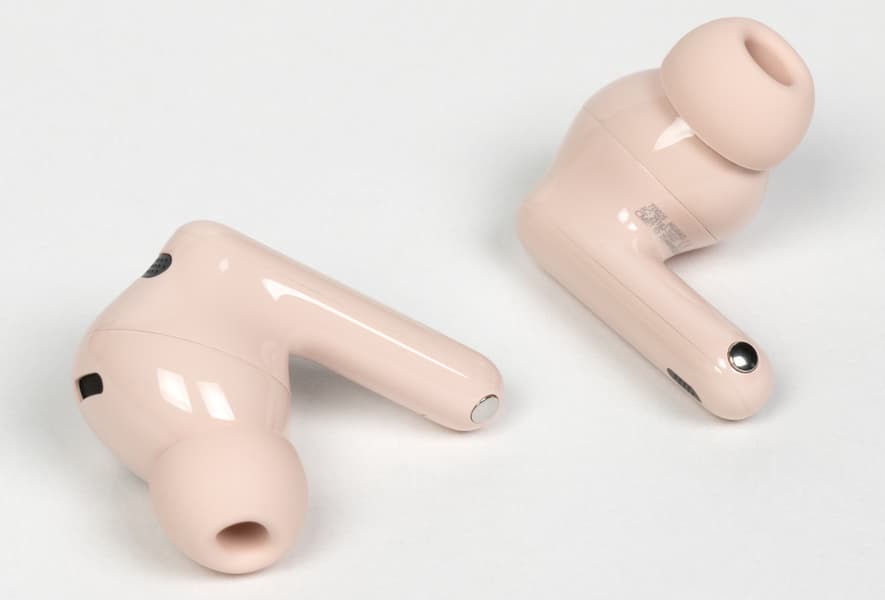 На внутренней стороне «ножек» нанесены обозначения левого и правого наушников. Внешняя панель сенсорная, но визуально это никак не выделено — в отличие от некоторых других TWS-наушников здесь нет характерных углублений или текстурированных участков, помогающих легче нащупывать сенсорную зону. Впрочем, это скорее дополнительная удобная мелочь, а не обязательный элемент, потому ее отсутствие вряд ли можно считать недостатком.