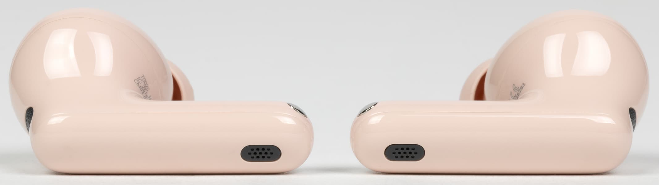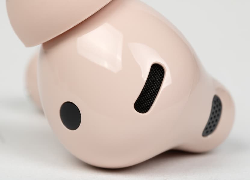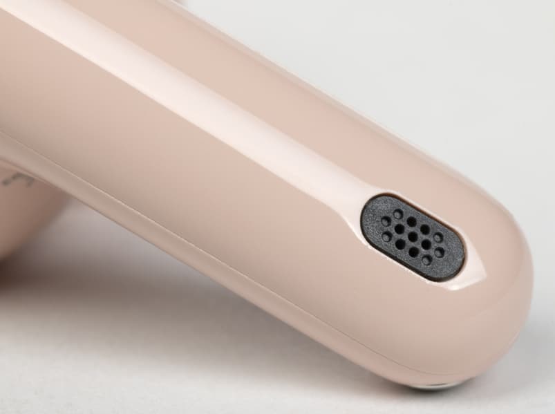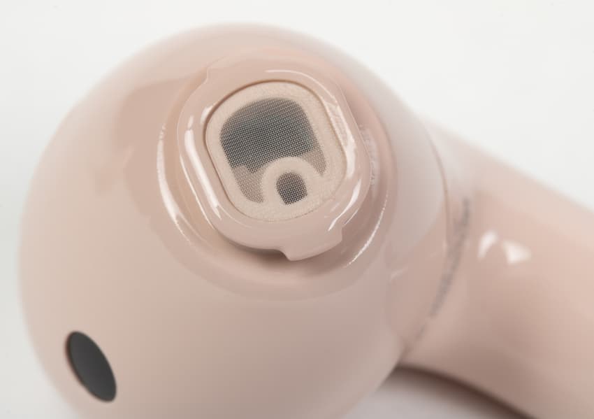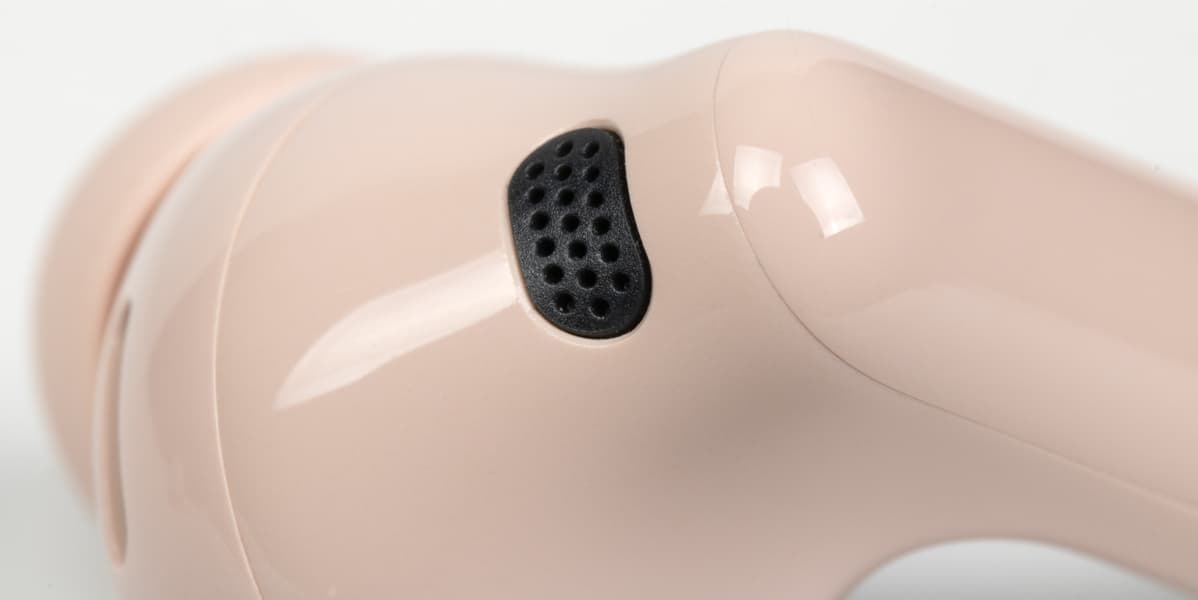 На обращенной в сторону уха при ношении поверхности округлой части находится щелеобразное отверстие внутренних микрофонов «шумодава», прикрытое изнутри металлической сеткой. Рядом видно круглое окошко ИК-датчиков ношения, ответственных за функцию автопаузы.