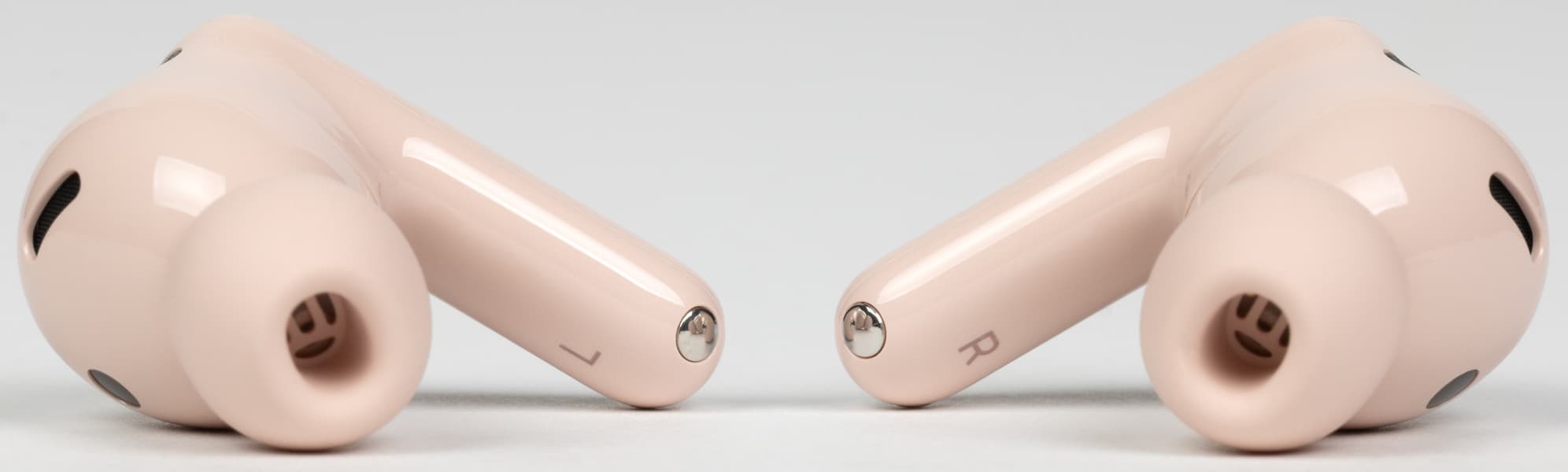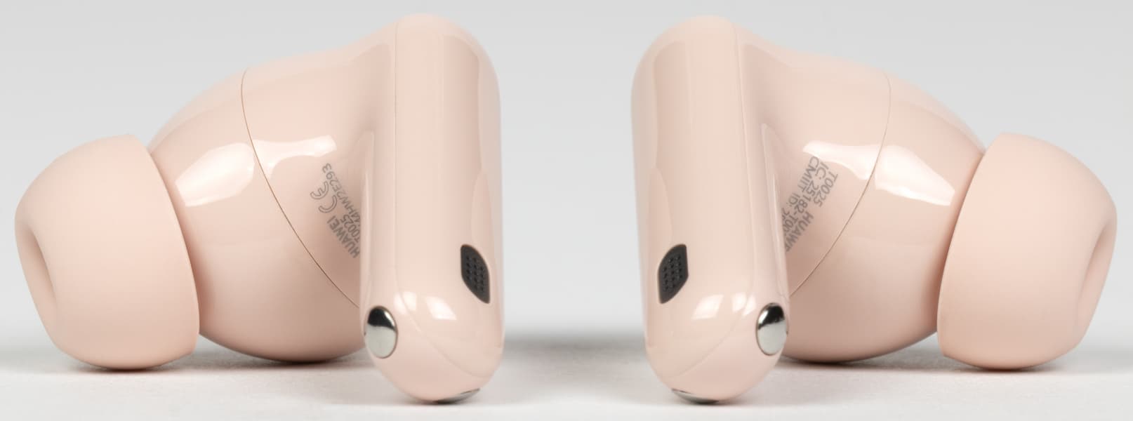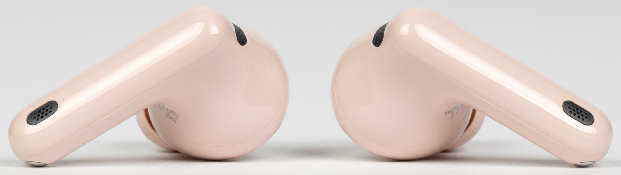 На обращенной в сторону уха при ношении поверхности округлой части находится щелеобразное отверстие внутренних микрофонов «шумодава», прикрытое изнутри металлической сеткой. Рядом видно круглое окошко ИК-датчиков ношения, ответственных за функцию автопаузы.