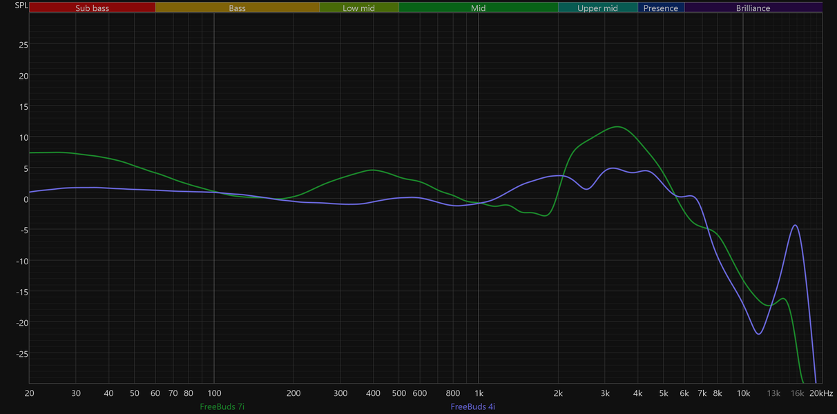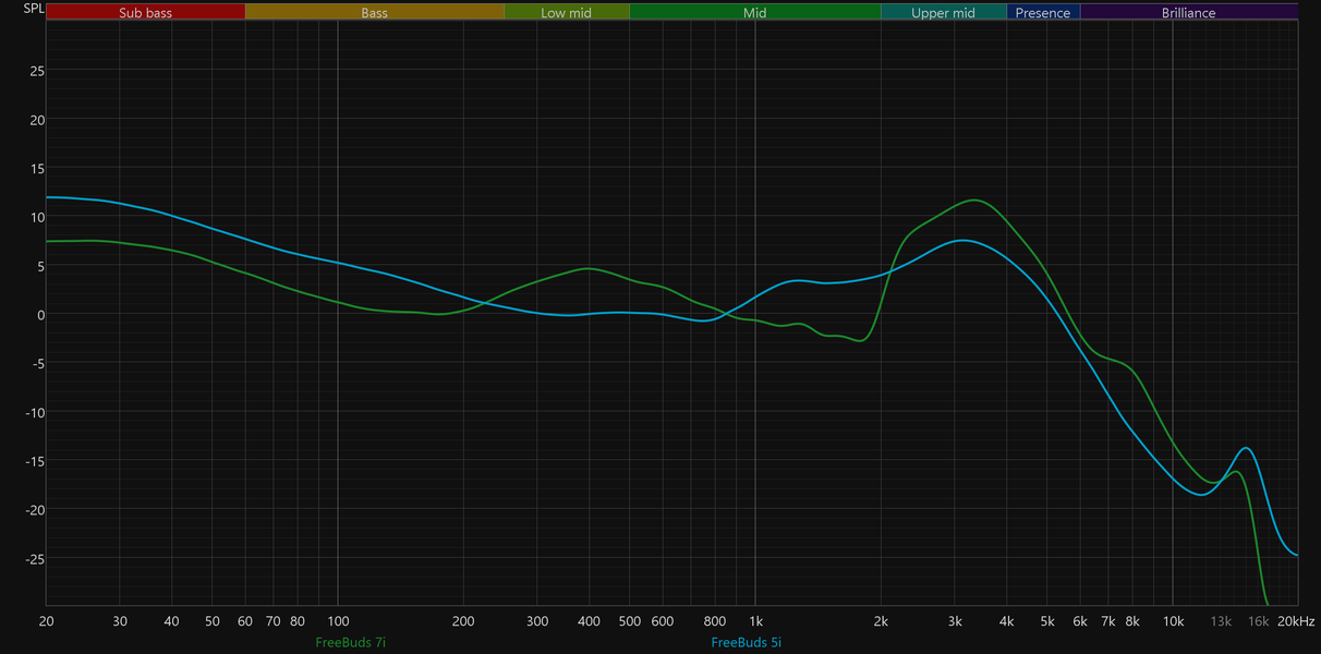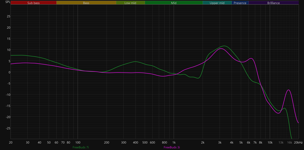 И напоследок — сравнение графиков АЧХ FreeBuds 7i и предыдущих моделей линейки. Хорошо видно, что Huawei постепенно двигается в сторону более эффектного звучания с яркими акцентами. Вероятно, это ответ на запрос аудитории, предпочитающей именно такую подачу. Но все же мы рады, что более сбалансированные пресеты остались доступными и легко активируются, а сами наушники неплохо поддаются эквализации.