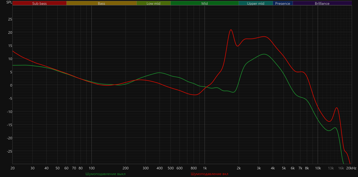 Подавляющее большинство по-настоящему эффективных систем активного шумоподавления негативным образом влияет на качество звучания гарнитур, приводя к появлению серьезных «провалов» в низкочастотном диапазоне. В данном случае встроенный DSP явно пытается скомпенсировать этот эффект, получается при этом довольно спорно. Где-нибудь в метро с «шумодавом» однозначно комфортнее, чем без него. Но в тихой обстановке лучше не забывать его выключать.