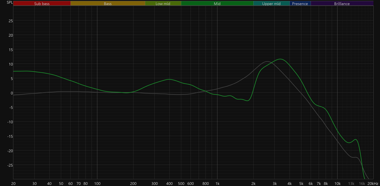 График АЧХ показан на фоне кривой IDF (IEM diffuse field compensation), предоставленной производителем используемого стенда. Ее задача — помочь скомпенсировать резонансные явления в имитированном слуховом канале и особенности оборудования, создав «звуковой профиль», максимально корректно иллюстрирующий то, как звучание наушников воспринимается слушателем. Ее можно рассматривать как адаптированный под конкретное устройство аналог так называемой «кривой Хармана», созданной командой Harman International под руководством доктора Шона Олива. Скомпенсируем полученный график АЧХ в соответствии с кривой IDF.