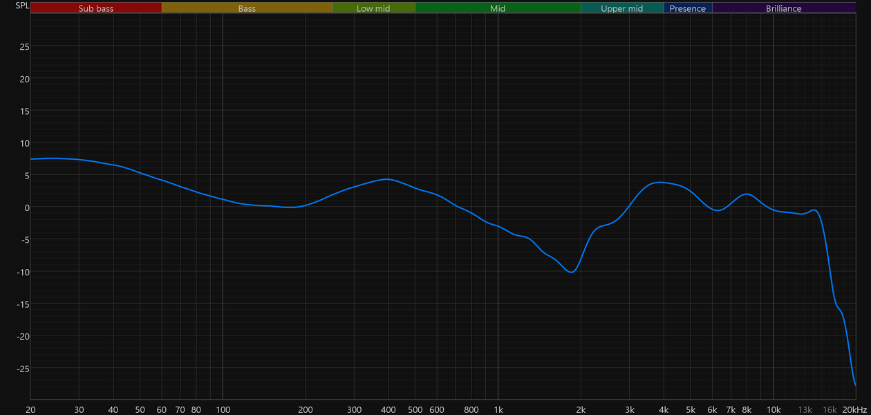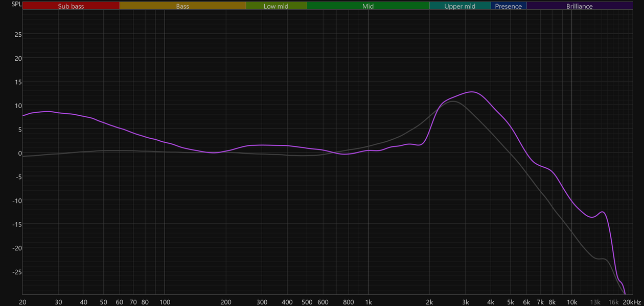 Акцент в области 350—400 Гц — одна из ключевых черт тюнинга наушников. С одной стороны он может добавить «телесности» звучанию вокала и инструментов, с другой — помешать восприятию средних частот, заметно снизив уровень детализации, особенно в плотных миксах. Более остро это ощущается на фоне отчетливого снижения уровня средних частот в диапазоне от 1 до 2 кГц, из-за чего вокал звучит менее естественно, а акустические инструменты теряют реализм. Зато такая настройка дополнительно подчеркивает края диапазона, и это точно оценят поклонники V-образного звучания.
