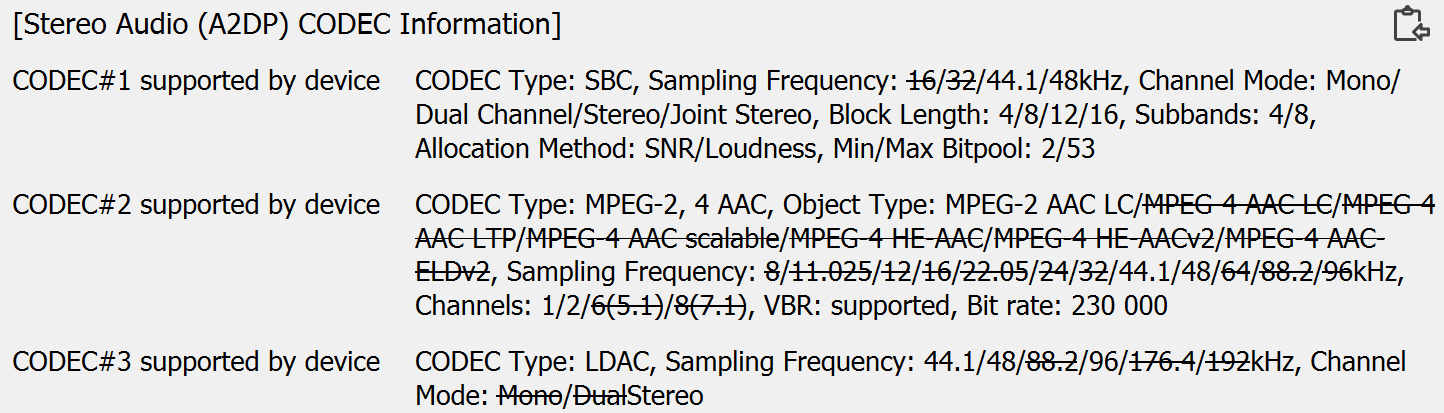 Полный список поддерживаемых кодеков и их режимов мы, как обычно, получили с помощью утилиты Bluetooth Tweaker. Кодеков три, как и заявлено: SBC, AAC и LDAC. Для SBC максимальное значение параметра Bitpool установлено на уровне 53, тогда как рекомендуемый профиль High Quality предполагает 51. У AAC битрейт ограничен, но на вполне приемлемом уровне — 230 Кбит/с. В обоих случаях кодеки работают на пределе своих возможностей или близко к нему.