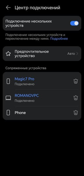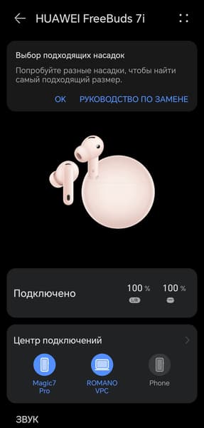 Под изображением гарнитуры на главном экране находится модуль, в котором отображается уровень заряда наушников и кейса. Далее размещен виджет центра подключений, который мы неустанно хвалим — Huawei первыми организовали его таким образом, сейчас мы периодически встречаем нечто подобное у других производителей. На странице его настроек можно увидеть полный список сопряженных устройств с возможностью удалить ненужные, а также выбрать предпочтительные, если это необходимо. Мы за все годы тестирований наушников Huawei так и не смогли найти причин воспользоваться этой опцией — автоматика отлично справляется сама, оперативно переключая фокус между устройствами в нужный момент.