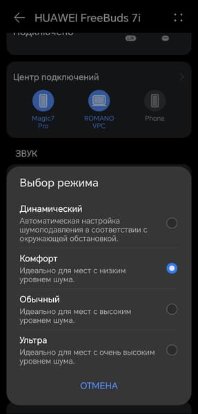 И именно в реальном использовании «шумодав» показывает себя с лучшей стороны — с ним становится ощутимо комфортнее. В режиме «Ультра» все еще присутствует знакомое многим чувство «давления в голове», но в большинстве ситуаций вполне достаточно стандартного уровня. Режим звуковой прозрачности остается полезным в случаях, когда нужно услышать объявление, ответить кассиру или обратиться к кому-то на улице, не вынимая наушники.