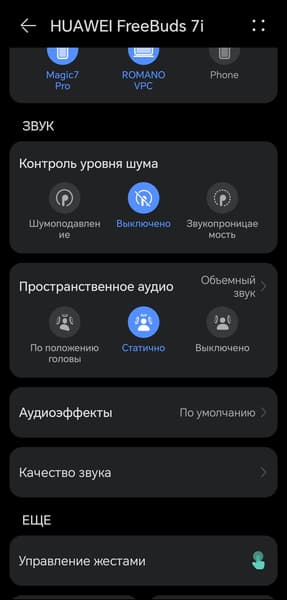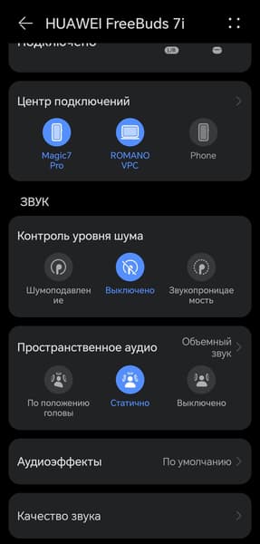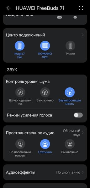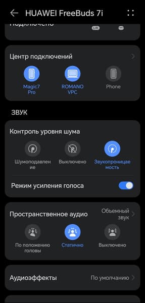 Одно из самых интересных нововведений Huawei FreeBuds 7i — так называемое пространственное аудио. В статичном режиме оно просто добавляет дополнительного объема за счет реверберации. На музыкальном материале это звучит довольно спорно, хоть порой и эффектно. А вот в кино такая подача, как правило, оказывается к месту. При активации режима отслеживания положения головы звуковая сцена «привязывается» к экрану — при повороте головы создается ощущение, что источник звука остается на месте. Возникает эффект, будто звук идет не из наушников, а напрямую с устройства — смартфона или планшета перед вами. Поворачиваете голову — и звук смещается в одно ухо, как если бы экран действительно оставался неподвижным. Деталь вроде бы и незначительная, но в долгом и утомительном перелете, например, способна добавить немного уюта, который точно не будет лишним.