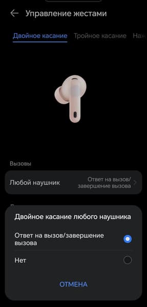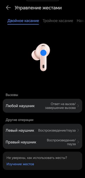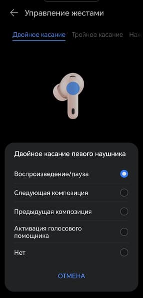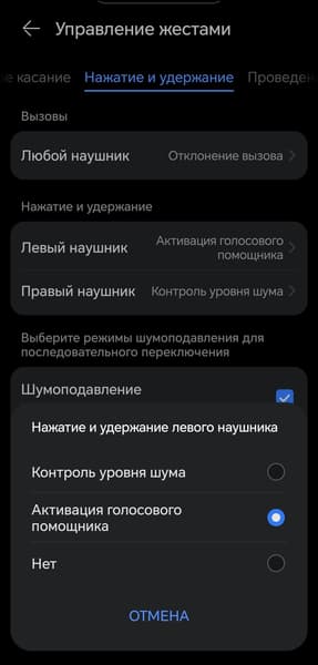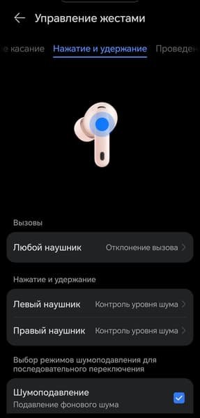 Касание и удержание отвечает за переключение режимов шумоподавления — при этом в настройках можно выбрать, между какими именно режимами переключаться. Свайпы управляют громкостью. Эту функцию можно только отключить — переназначить на другое действие нельзя.