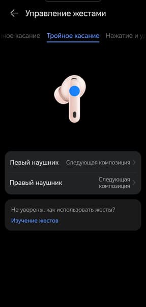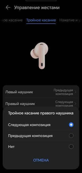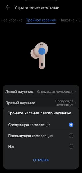 Доступна и настройка тройного касания, но выбора, по сути, нет — можно назначить только переключение треков. Соответственно, имеет смысл оставить за двойным нажатием управление воспроизведением, а при необходимости — добавить на один из наушников активацию голосового ассистента.