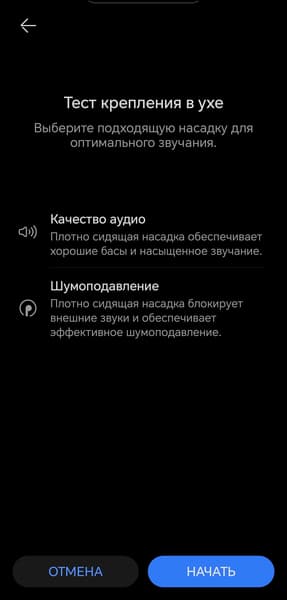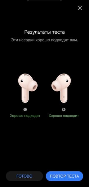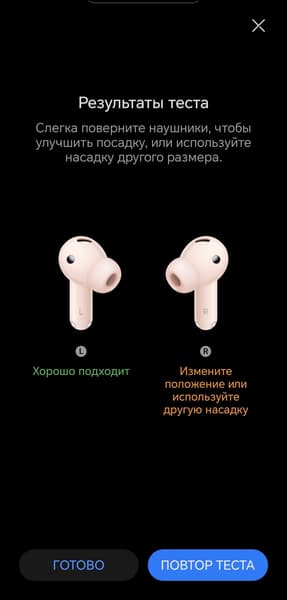Тест правильности посадки вновь реализован классическим образом. При его запуске наушники воспроизводят короткую мелодию, а внешние микрофоны пытаются ее уловить. Если звук «пробивается» наружу, приложение сообщает о плохой герметичности — стоит попробовать сменить насадки или скорректировать посадку. Мы вновь проверили, как работает функция: слегка ослабили правый наушник — приложение сообщило нам о необходимости поправить его положение или сменить насадку.