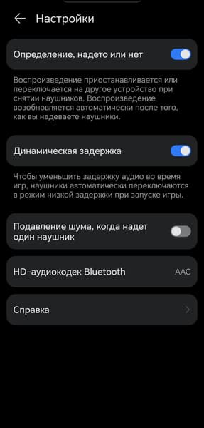 Датчики ношения работают корректно: если вынуть один наушник, воспроизведение приостанавливается, а при возврате — автоматически продолжается. Есть и дополнительная функция — при извлечении одного наушника активируется режим звуковой прозрачности. Это позволяет избежать неприятного ощущения «давления», которое часто возникает, когда в ухе остается только один наушник с активным шумоподавлением. Опция включается в настройках, там же можно полностью отключить автопаузу. В этом же разделе доступны выбор активного кодека, настройка динамической задержки (режим с пониженным битрейтом для игр) и обширная справка в формате вопросов и ответов.