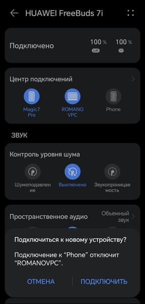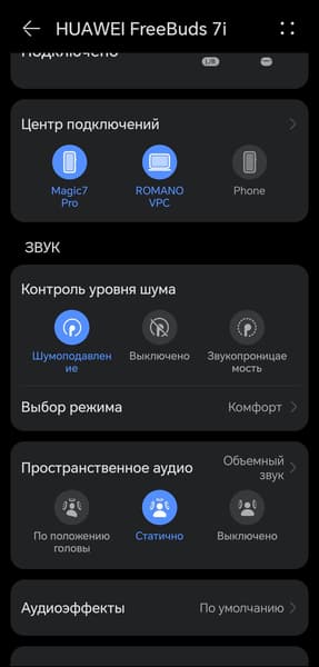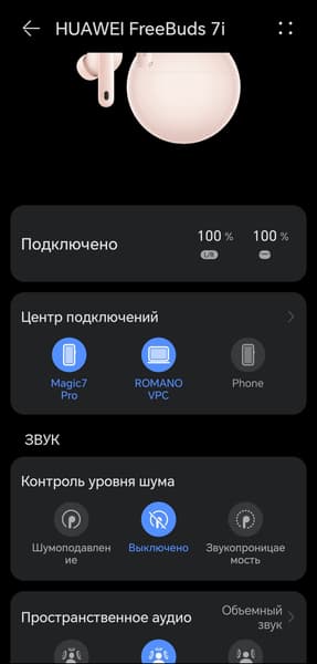После первого открытия крышки гарнитура сразу активирует режим сопряжения, далее может потребоваться нажать кнопку на боковой части кейса в течение пары секунд. Наушники при этом должны находиться в внутри. Huawei FreeBuds 7i поддерживает Microsoft Swift Pair для соединения с устройствами, работающими на Windows. А вот Google Fast Pair по-прежнему отсутствует: есть только ускоренное сопряжение с гаджетами Huawei. Владельцам устройств других брендов придется воспользоваться стандартной процедурой через меню настроек — благо, она проста и занимает не больше пары минут.