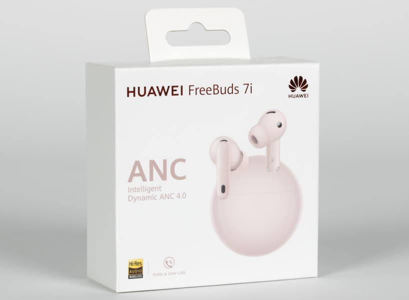 Упаковка Huawei FreeBuds 7i выполнена в классической для наушников производителя манере — коробка из плотного белого картона со съемной крышкой, на которую нанесены изображение и название наушников, логотип производителя, а также появившийся в позапрошлой модели значок Hi-Res. При этом интересным образом меняется оформление логотипа. В «пятерках» он был выполнен черным цветом — как у бюджетных наушников производителя. В шестой версии сделан золотистым — как у флагманов, что мы в свое время расценили как знак взятого курса на «сближение» двух семейств. Ну а у FreeBuds 7i он тоже блестящий, но уже с красноватым оттенком — будем считать, что это намек на то, что «бюджетный флагман» все же движется своим путем.
