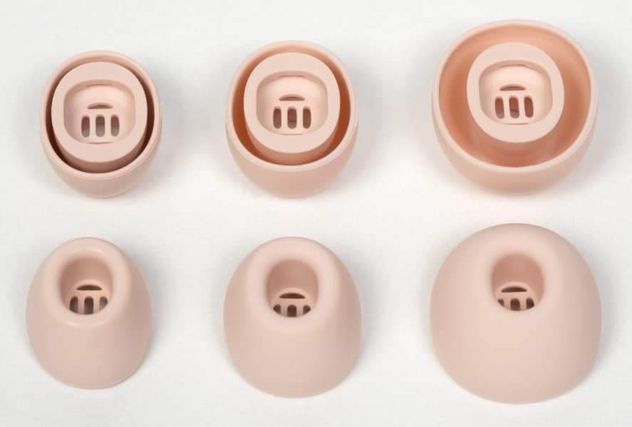 В анонсах прошлой модели производитель делал особый акцент на обновленных насадках, которые «сделаны из гипоаллергенного жидкого силикона» и имеют увеличенную толщину, что позволяет добиться более плотного прилегания к ушному проходу, а следовательно — более надежной посадки и повышения уровня пассивной звукоизоляции. Судя по всему, новая модель унаследовала их от своей предшественницы.