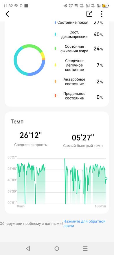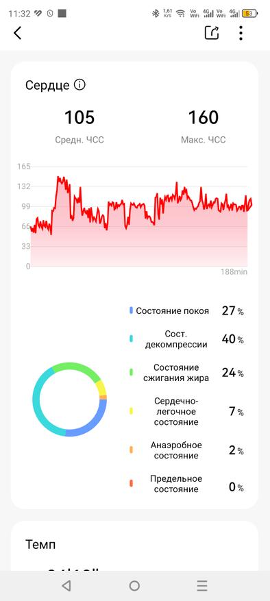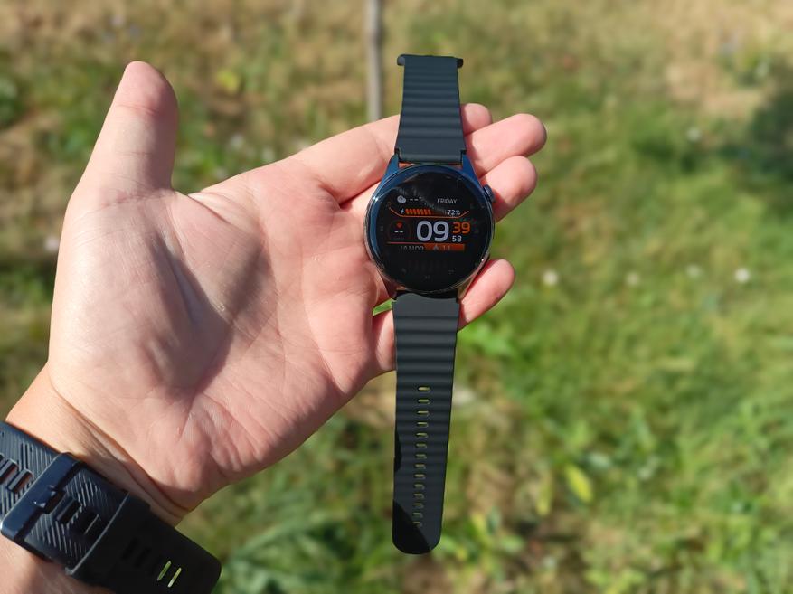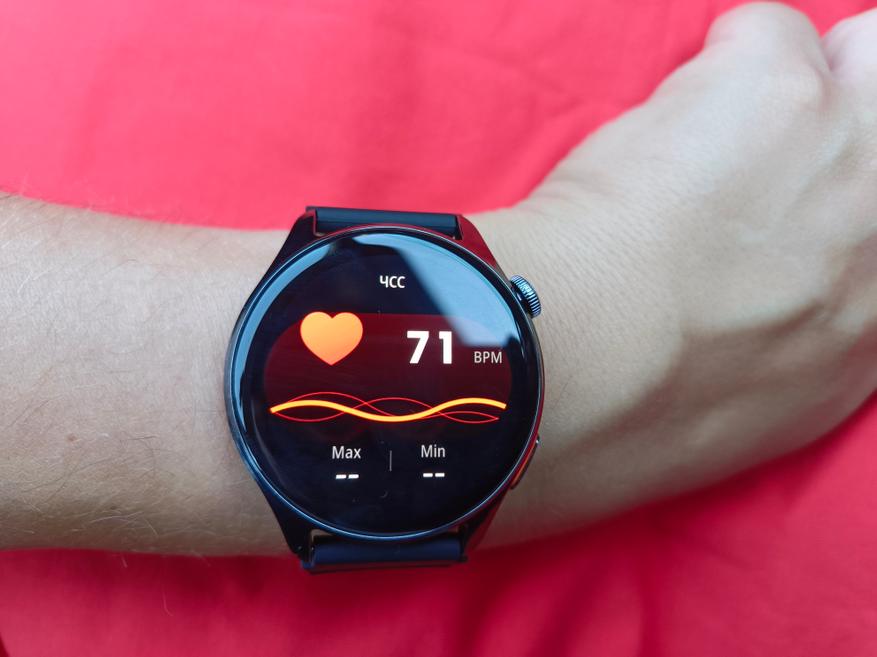 Датчик кислорода показывает значения от 97% до 100%, что считается нормой для здорового человека. Пульс измеряется в целом точно как на низких, так и на высоких значениях. В ручном измерении пульс составил 72 удара, тонометр показал — 70, а мои основные часы Huawei Watch GT5 Pro зафиксировали — 72. Обозреваема модель показала 71 ударов в минуту.