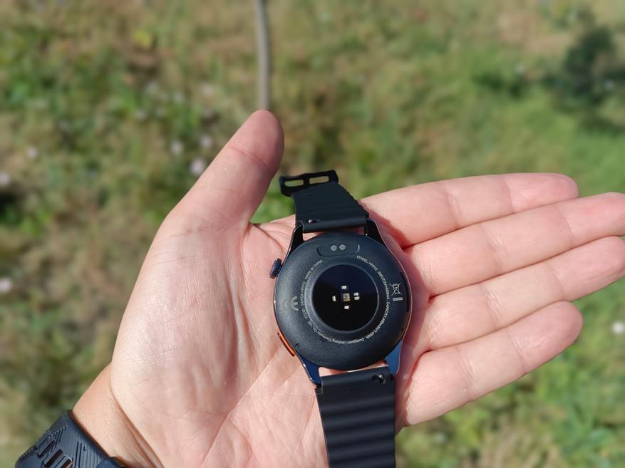 Часы имеют классический дизайн круглой формы. Сбоку расположены две кнопки, а на обратной стороне — контактные площадки для зарядки, датчики кислорода и пульса. В комплекте два силиконовых ремешка: один уже надет на часы, второй лежит в коробке. Застежка металлическая, с быстросъемным механизмом.