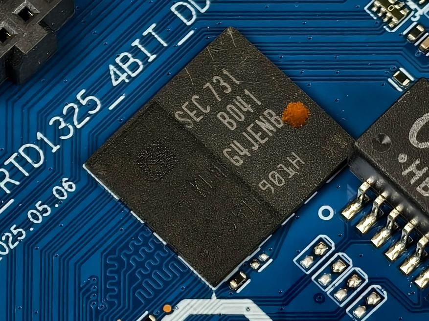 Плата крупным планом. По центру чип RTD1325TPB, выше eMMC флеш память KLMCG4JENB-B041, ниже чипы DDR3 оперативной памяти D9PQL от Micron.