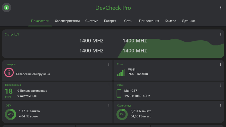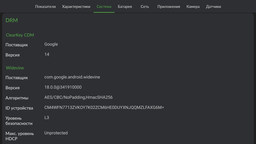 Теперь пройдемся по тестам, но сперва предлагаю ознакомиться с информацией о железе из утилиты DevCheck Pro. Она подтверждает заявленные характеристики: Realtek RTD1325 с графикой Mali G57 MC1, память 4GB + 64GB и WiFi6. Также из утилиты видно, что уровень безопасности Widewine L3, а значит для Netflix приставка не годится.