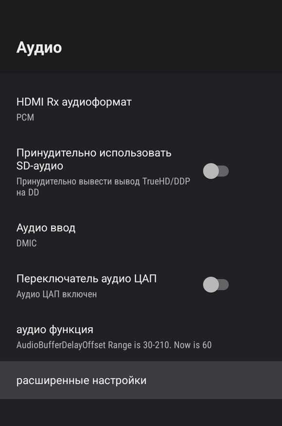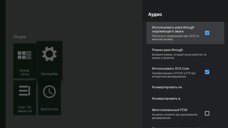 По декодированию многоканального звука возможности весьма ограничены, отдельный S/PDIF выход у коробки отсутствует. Настроек много, но по факту они бесполезны. Из полезного могу отметить лишь «режим сквозного выхода HDMI», который позволяет передать звук без обработки на ваше воспроизводящее устройство.