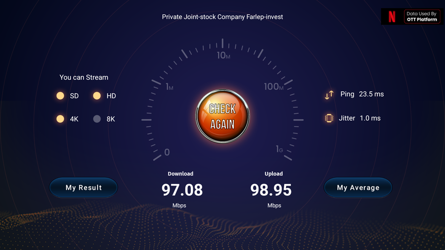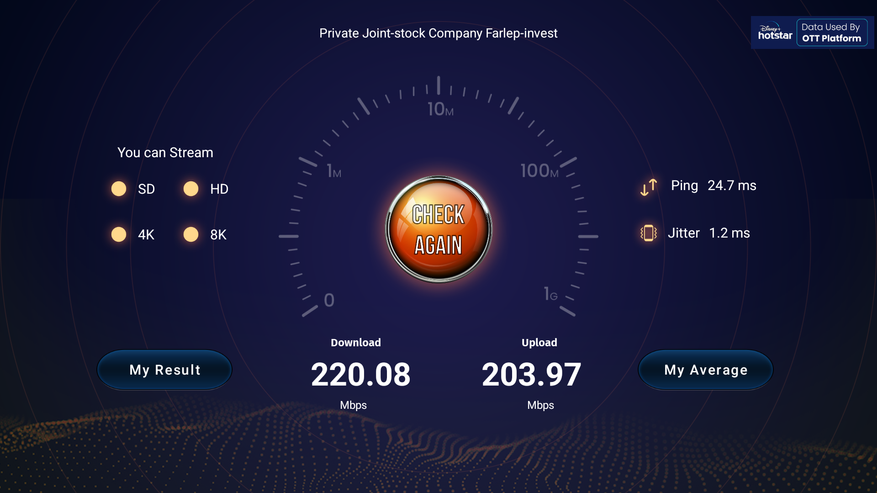 Что касается скорости интернета, то здесь все достаточно интересно. С одной стороны нам предлагают современный WiFi 6 модуль, но с другой стороны у него всего одна передающая и одна принимающая антенна. В итоге по скорости приставка не получает никаких преимуществ по сравнению с моделями где используется WiFi 5, но с технологией 2T2R. На загрузку 220 Mbps, на отдачу 203 Mbps. Антенны не слишком чувствительны, поэтому если роутер расположен где-то в другой части квартиры, то скорость падает еще в 2 — 3 раза. По проводу есть честная сотка.
