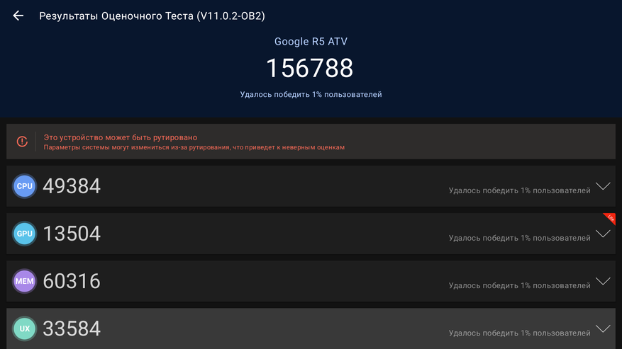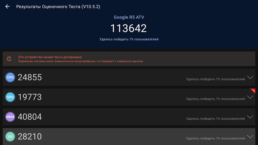В комбинированном тесте Antutu 11 приставка набирает 156 800 баллов, в Antutu 10 — 113 600 баллов. И в целом это стандартные результаты, на уровне других моделей на Realtek RTD1325.