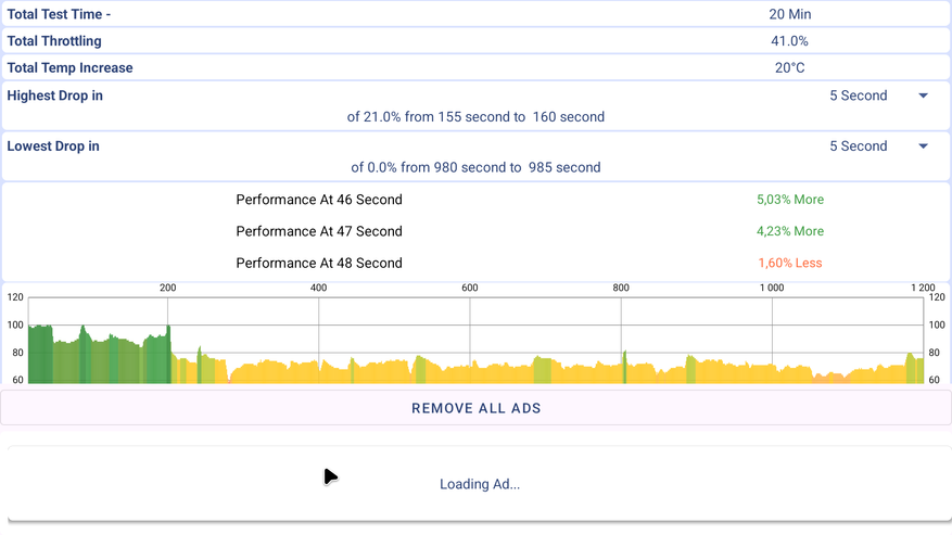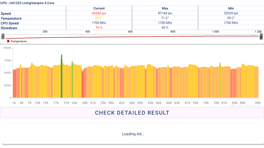 Теперь по стабильности. Троттлинг тест не обнаружил термального троттлинга при 30 минутном тесте на 100 потоках. Средняя производительность 51,288 GIPS, что также немного выше, чем у других боксов на этом чипе (от 48 до 49 GIPS).
